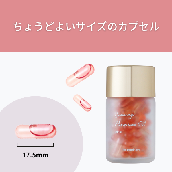 月見草油(中国製造)、ゼラチン(豚由来)、ビタミンE、ローズオイル、クチナシ色素1日1~2粒を目安に、水やぬるま湯と一緒にお召し上がりください。