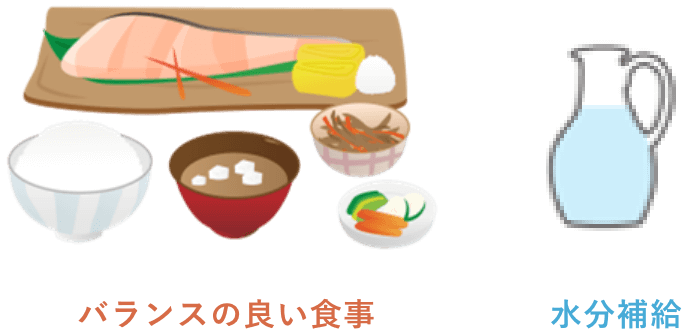 消化の良いものから少しずつ食べはじめ、身体をゆっくり目覚めさせます。バランスの取れた食事とともに、引き続き積極的な水分補給を心がけましょう。