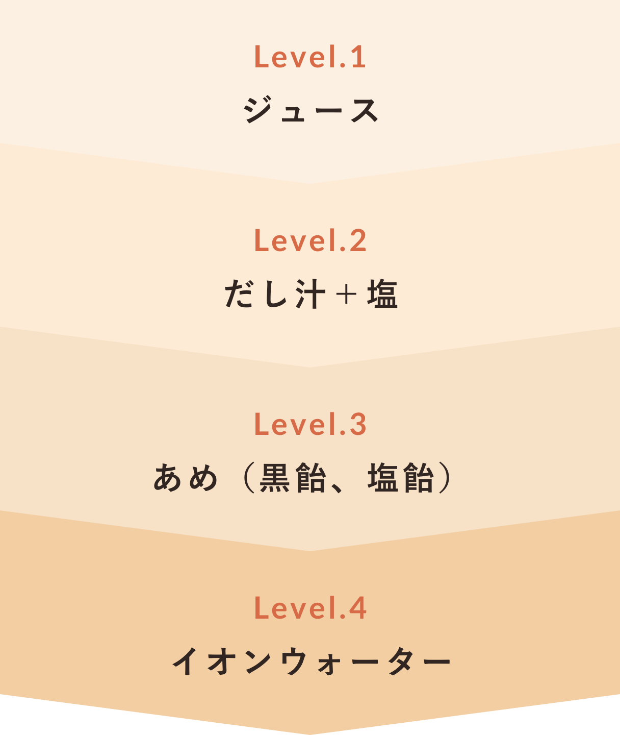 水分補給水分はこまめにたくさん摂りましょう。ジュース以外に、2ℓ程度が目安です。