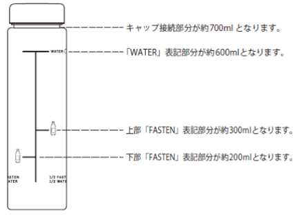 中身が見えるクリアボトル。メモリ付きでジュース作りが簡単にできます。 ファスティングだけでなく、オリジナルのフレーバーウォーター用などにもおすすめです。